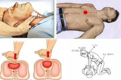 判定心脏骤停的方法:患者突然意识丧失,呼之不应,颈动脉搏动消失(检查方法如左上图)。注意:发现患者意识丧失,应将患者摆放平卧位,避免来回摇晃患者。非专业人士可不触摸有无颈动脉搏动;若触摸,则判定时间需短于10秒钟。