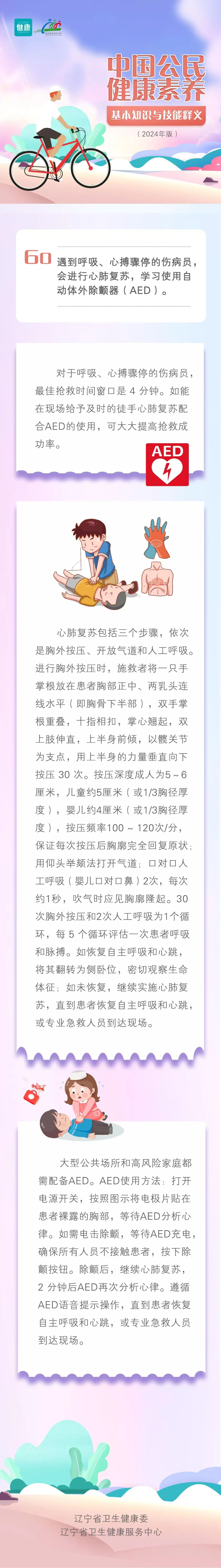 新版健康素养66条|遇到呼吸、心搏骤停的伤病员,会进行心肺复苏,学习使用自动体外除颤器(AED)