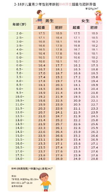 通过体重指数(BMI)可以判断儿童是否肥胖:体重指数(BMI)=体重(kg)/身高(m)的平方。家长可以通过公式算出具体的BMI值,结合《2-18岁儿童青少年性别年龄别BMI筛查超重与肥胖界值》进行判断。